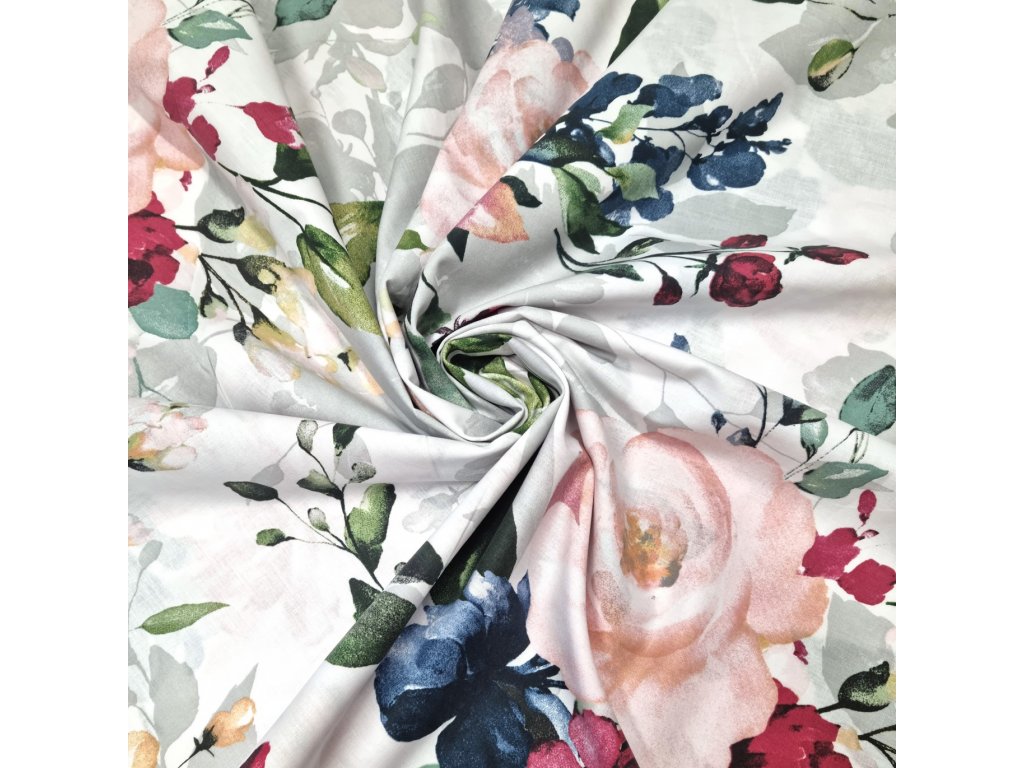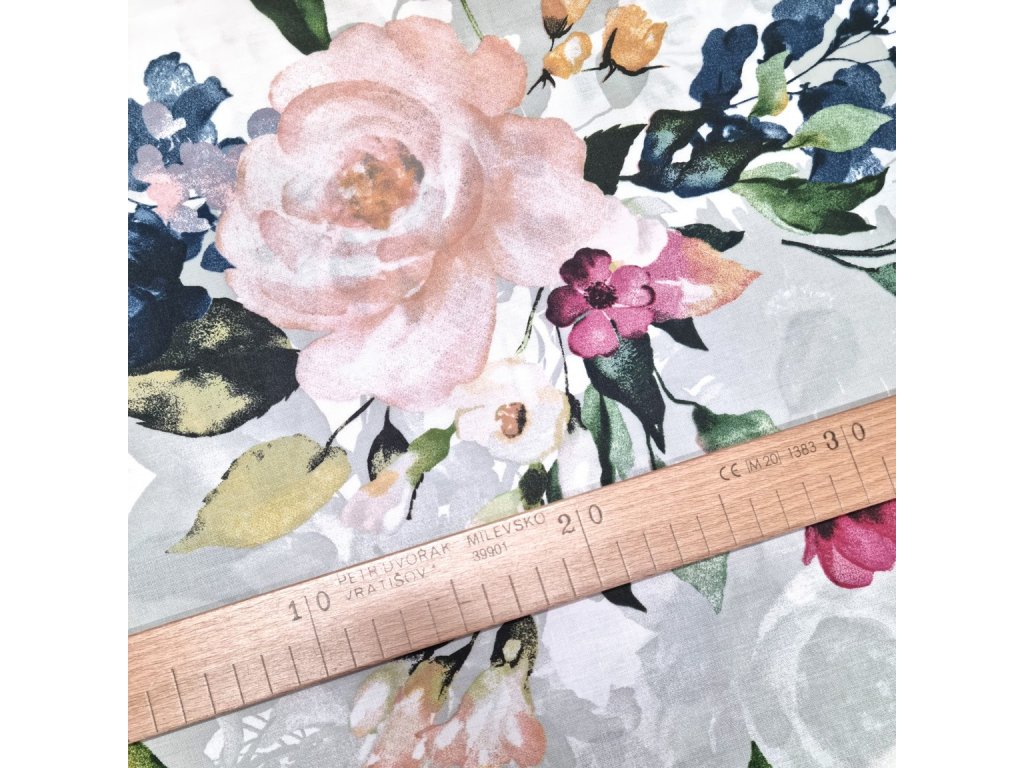 Materiál je matný, s velkými růžemi, na bílém podkladu. Látka je krásná, je to prostě poctivé plátýnko.