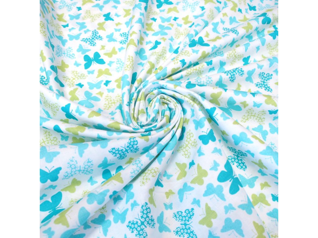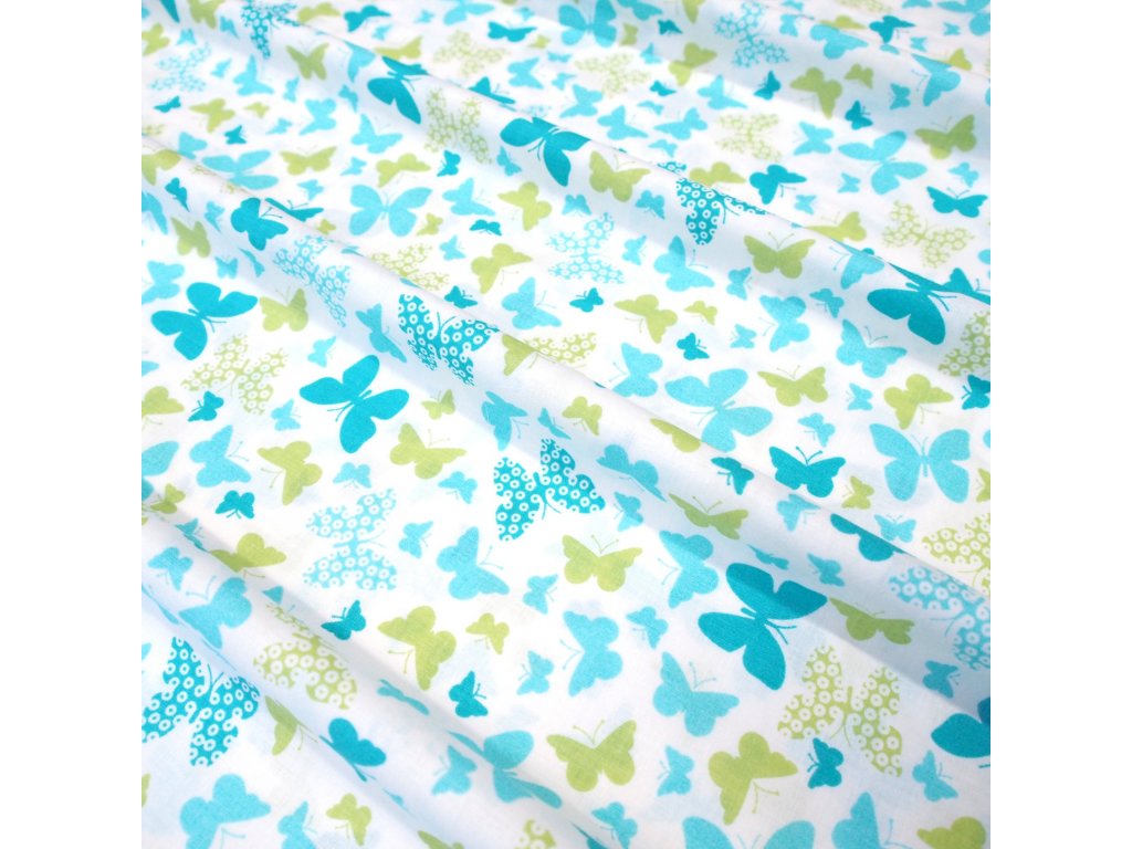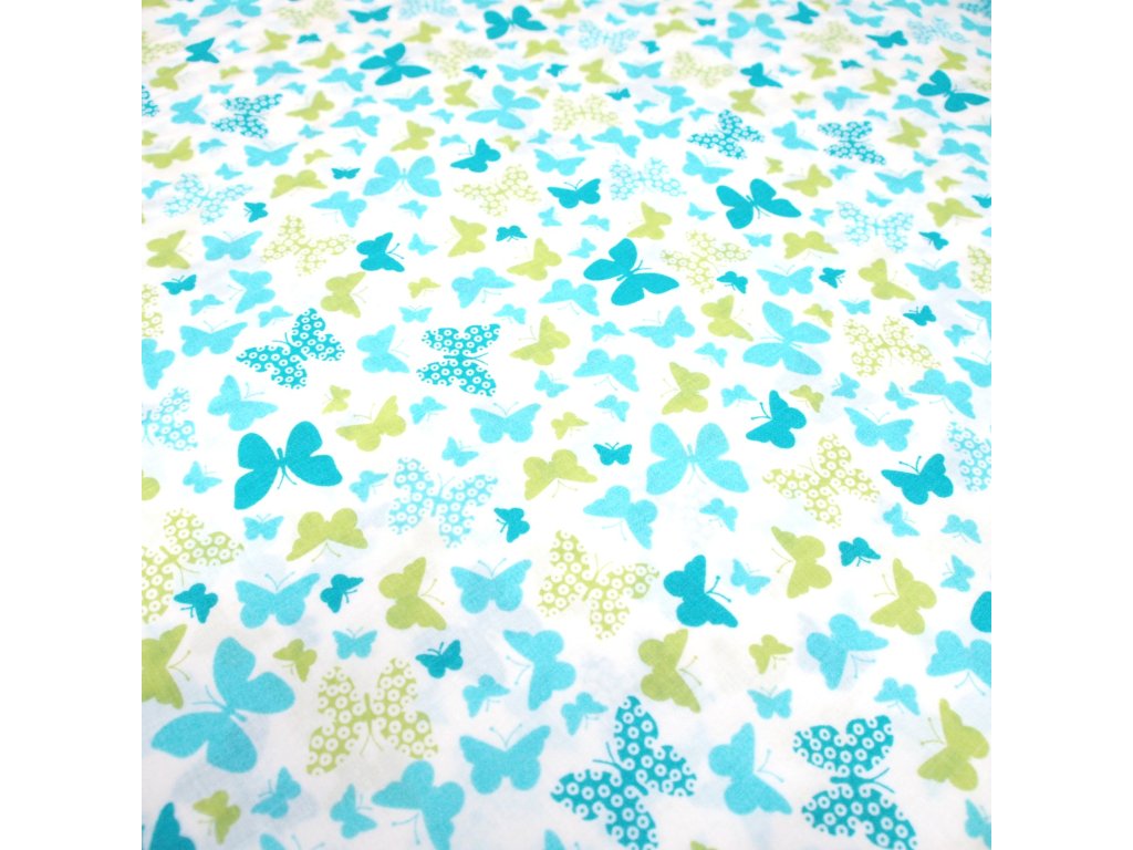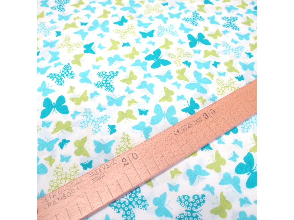 Použitý materiál je matný, se vzorem modrých motýlů, na bílém podkladu. Látka je krásná, je to prostě poctivé plátýnko