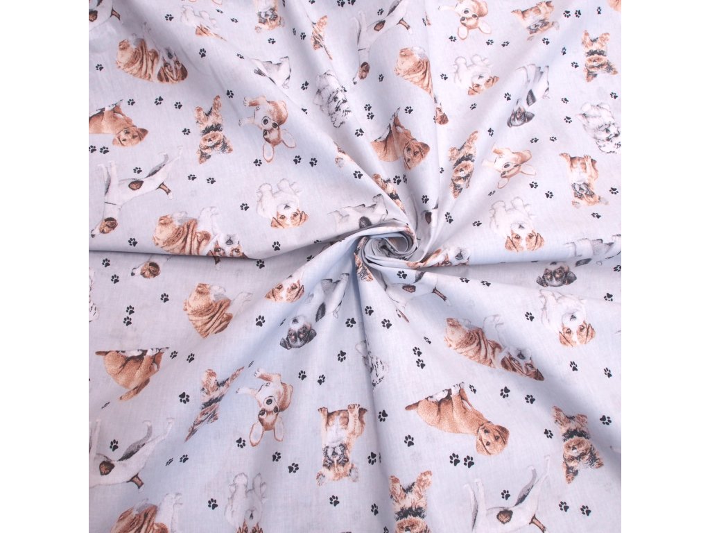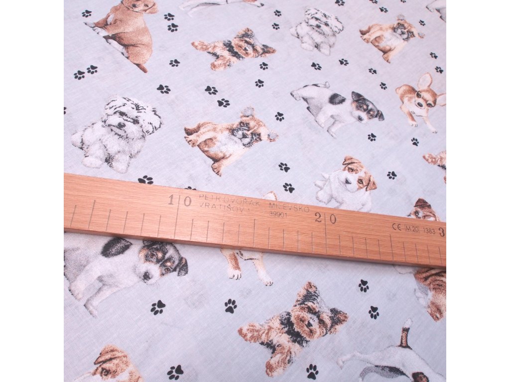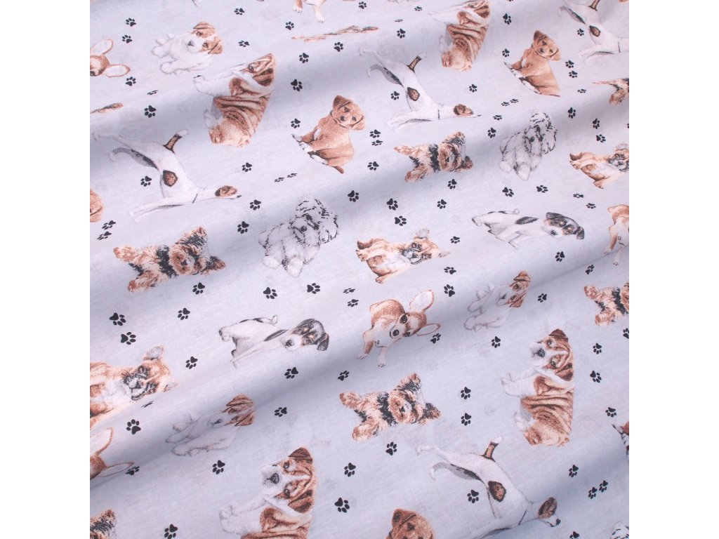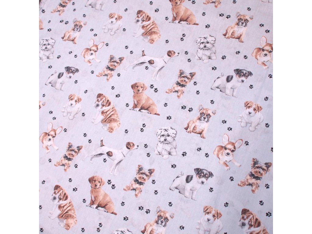 Použitý materiál je matný, se vzorem pejsků různých ras, na svěle šedém podkladu. Látka je krásná, je to prostě poctivé plátýnko