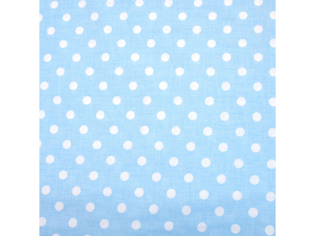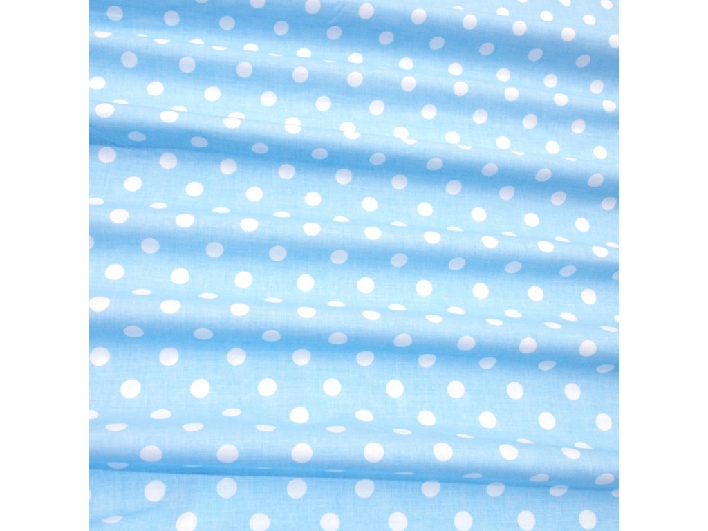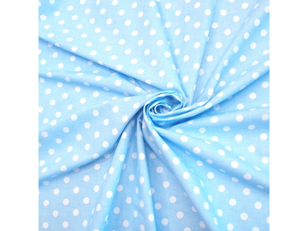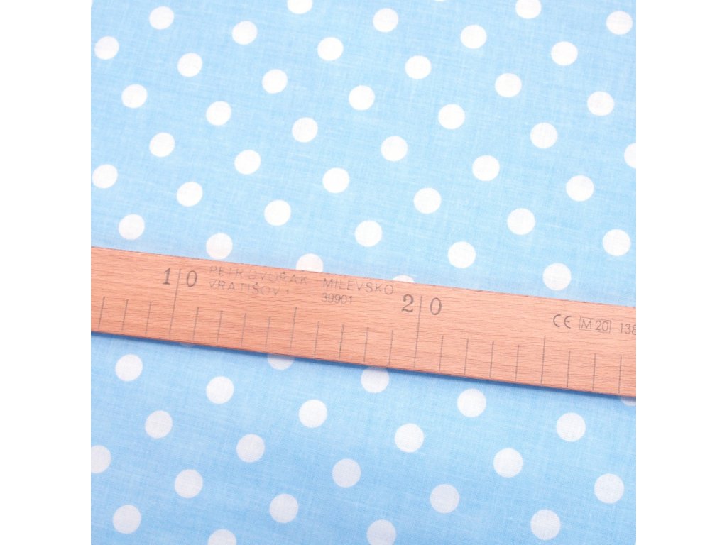 Použitý materiál je matný, s motivem bílých puntíků, na světle modrém podkladu.
