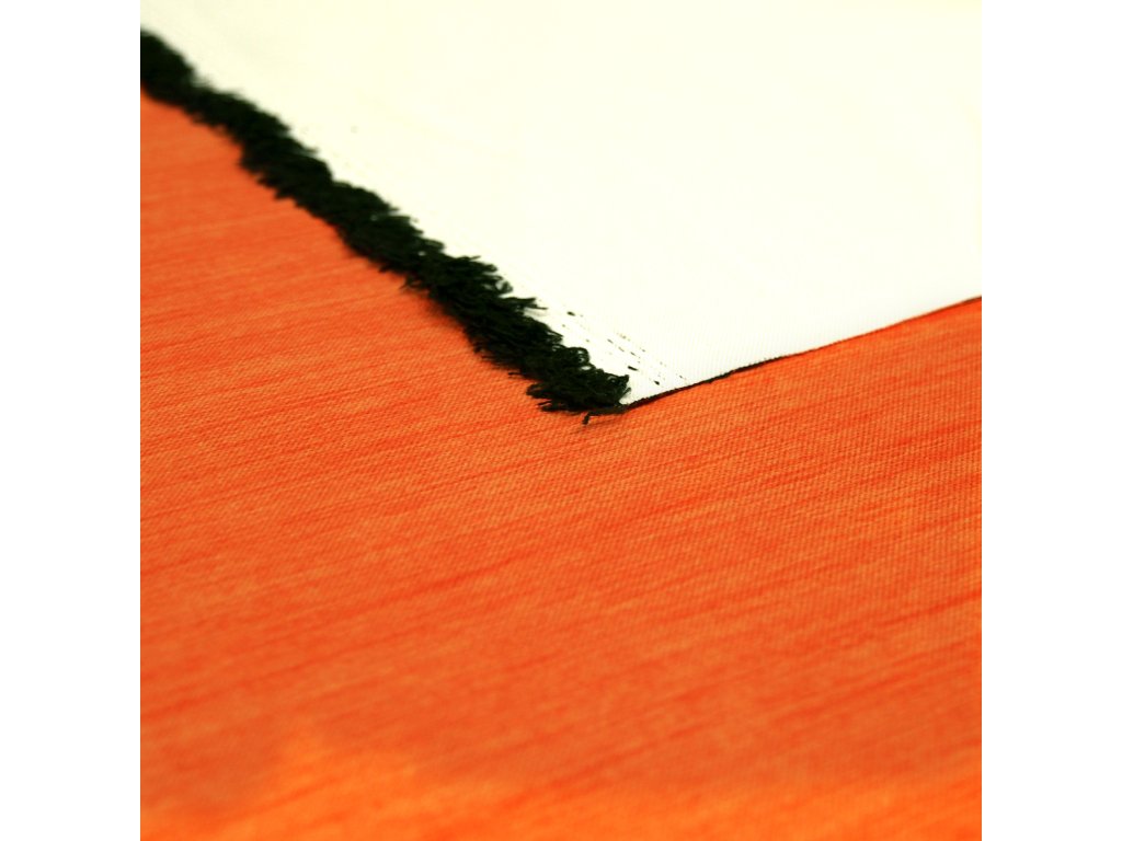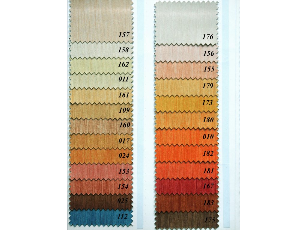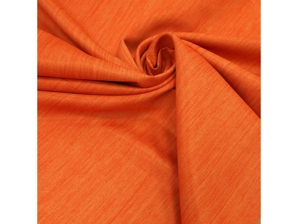 Použitý materiál je nemačkavý, příjemný na omak. Black out patří mezi vysoce funkční materiály. Je to dekorační látka, která dokanale zatemní a tlumí hluk. Jak je to možné? Je třívrstvá - lícová strana látky je béžovo-hnědá, uvnitř je vetkávaná černá vrstva a rubová strana je bílá. Látka je jednobarevná. Barva je oranžová. Vzorem tohoto závěsu jsou decentní jemné čárky.