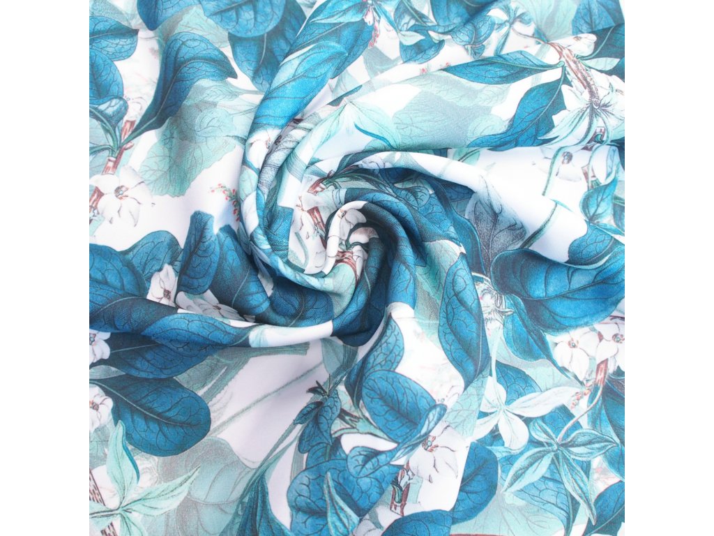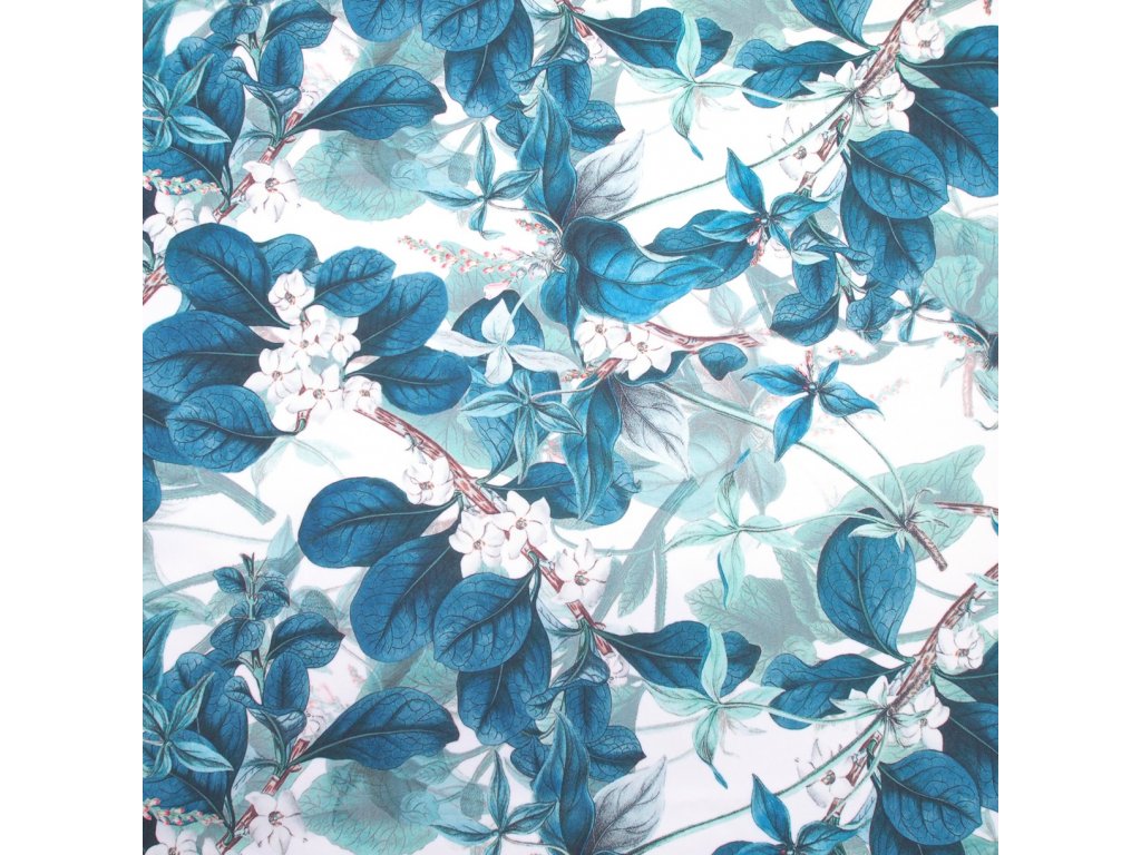 Materiál je matný, s digi tiskem petrolejových, tmavě zelených listů doplněné o bílé květy. Látka je krásná, nemačká se, krásně splývavá.