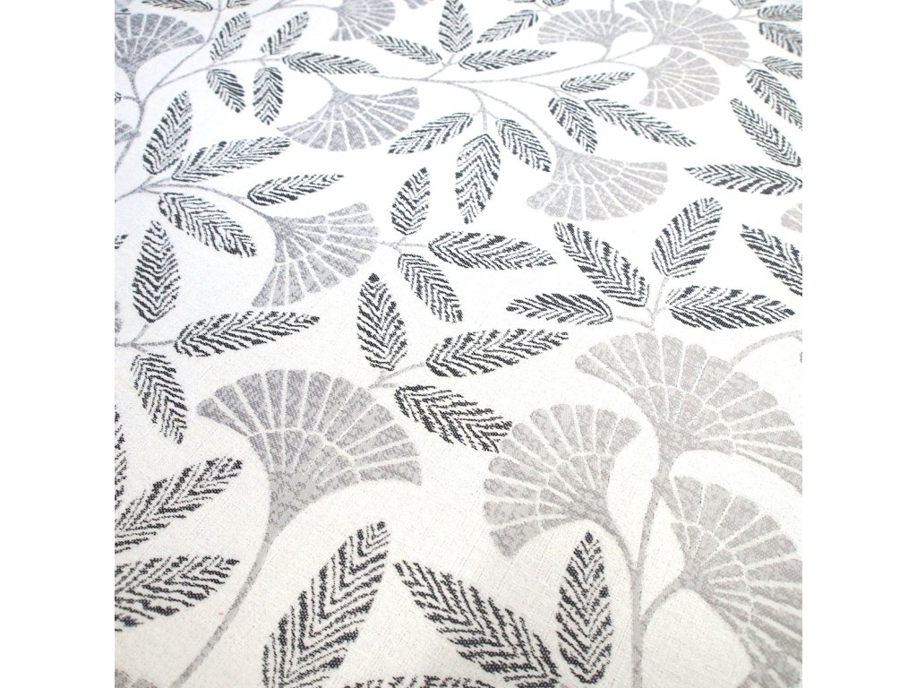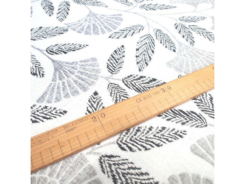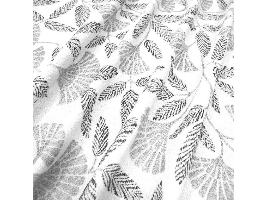 Použitý materiál je matný s motivem šedo-černých listů v na bílém podkladu. Potahová látka je prodávána na metráž.