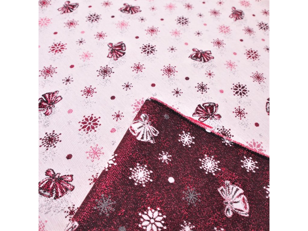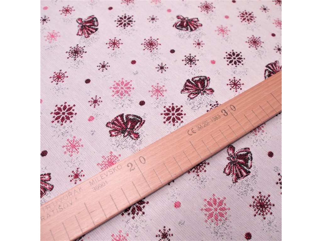 Látka je kvalitní, pevnější. Podklad této vánoční látky je jednobarevný, režný, se vzorem vloček a zvonků, které jsou lesklé v červené barvě.