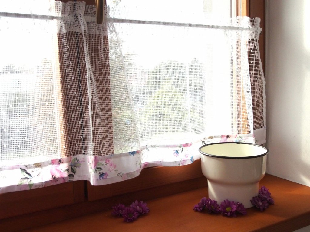 Dole má záclonka našitý kraj z bavlněné látky se vzorem malých růžiček.